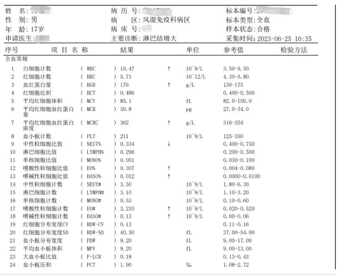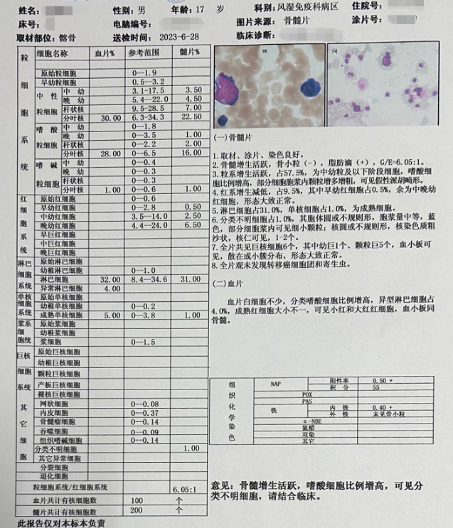 血片意見:白細胞不少,嗜酸性粒細胞增高,異型淋巴細胞4.0%,成熟紅細胞大小不一,可見小紅、大紅紅細胞,血小板同骨髓。