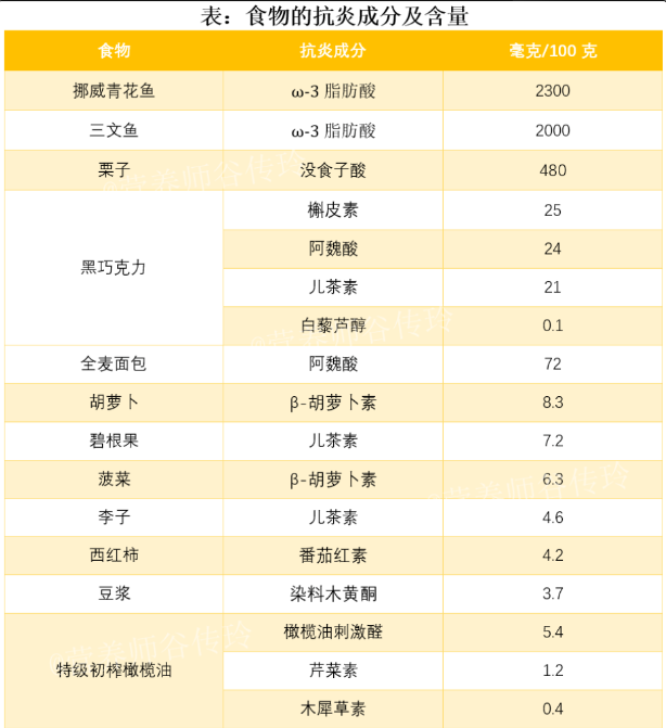 抗炎飲食可以改善體內(nèi)的炎癥因子,避免發(fā)展出疾病。比如:碳水化合物:推薦全谷物碳水化合物,比如藜麥、糙米、蕎麥、黑米等等。脂肪:多選擇單不飽和脂肪酸和多不飽和脂肪酸,比如魚(yú)蝦、貝類(lèi)、亞麻籽油等含有多不飽和脂肪酸、歐米伽-3型脂肪酸。蛋白質(zhì):選優(yōu)質(zhì)蛋白質(zhì),如魚(yú)、家禽、雞蛋、瘦紅肉,以及低脂乳制品和大豆食品。蔬果:十字花科蔬菜和莓果類(lèi)是最被推薦的“抗炎選手”。富含多酚、黃酮的食物:如綠茶、大豆等;香辛料:如姜黃、生姜、肉桂、肉蔻、大蒜等等在“抗炎飲食”榜上有名。⑥2023年5月國(guó)家注冊(cè)營(yíng)養(yǎng)師谷傳玲根據(jù)文獻(xiàn)研究,整理出了12種“抗炎王者食物”,供大家日常飲食中參考。